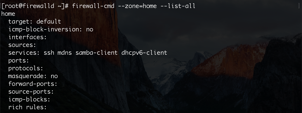 7. But, you can still list the rules for a specific zone, say, the 'home' zone.