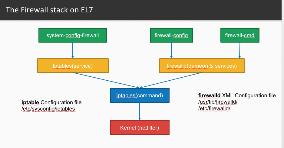 In RHEL6, we had IPtables. Now, in RHEL7, the firewall mechanism or say, the firewall daemon changed to Firewalld. Both serve the same purpose, i.e; packet filtering using the Netfilter module inbuilt in the Linux kernel. However, it is important to know why the Firewalld took over the IPtables. In Firewalld, you can change settings dynamically whilst being on production compared to IPtables which needs to flush out the entire rules set once a change has been made. Another difference is that during the installation of firewalld, you have support for both IPv4 and IPv6 compared to IPtables, you will have to install Ip6tables for IPv6 support. For those who are not acquainted with IPv6, please check out the article on "Diving into the basics of IPv6". To briefly describe Firewalld, it is a set of services and daemons that manage the Netfilter in the Linux kernel. Finally, it is important to understand that both RHEL6 and RHEL7 used the IPtables (commands) to talk to the Netfilter.
