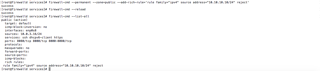 firewall-cmd --permanent --zone=public --add-rich-rule='rule family="ipv4" source address="10.10.10.10/24" reject'