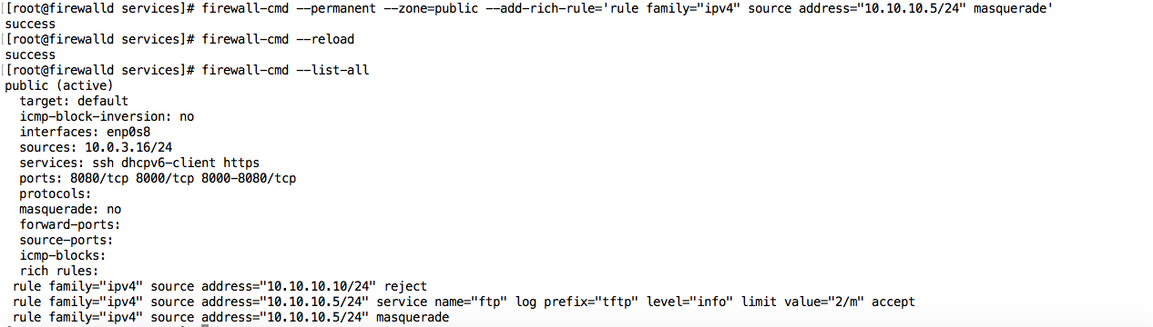 [root@firewalld services]# firewall-cmd --permanent --zone=public --add-rich-rule='rule family="ipv4" source address="10.10.10.5/24" service name="ftp" log prefix="tftp" level="info" limit value="2/m" accept'