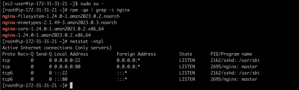 2. After the instance is launched, you should see nginx installed, enabled, and of course, listening on port 80. It might take some time though to fully execute the script.