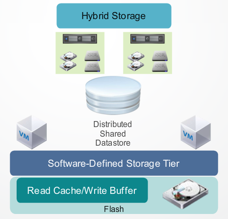 Hybrid Storage - In a hybrid storage architecture, virtual SAN pools server attached hard disk drives (HDDs or SSDs) to create a distributed shared datastores that abstract the storage hardware to create a Software-Defined Storage Tier for virtual machines. Flash is used as a read cache / write buffer to accelerate performance and magnetic disk provide data persistance.