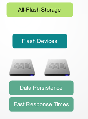 All-Flash Storage - In this architecture, Flash devices are intelligently used as a write cache, whilst SSDs provide data persistence and consistent fast response times.Â