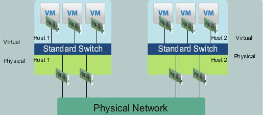 Standard switch - can bridge traffic internally between virtual machines in the same port group and link to external networks. You can use standard switches to combine the bandwidth of multiple network adapters and balance communication traffic among them. You can also configure a standard switch to handle physical NIC failover. Standard switch models a physical Ethernet switch. The default number of logical ports for a standard switch is 120. Each uplink adapter associated with a standard switch uses one port.