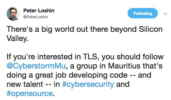 The next step of cyberstorm.mu is championing several tracks for the IETF 103 hackathon remotely at Bangkok, Thailand. We have been welcomed by many people both from Mauritius and overseas, even from Silicon Valley, USA. No wonder, our past achievements is now a new step to reach today's objectives - To focus heavily on research and development. Loganaden Velvindron from cyberstorm.mu mentioned on his Medium blog about the change cyberstorm.mu want to achieve: "The name cyberstorm.mu is an interesting one. It’s about change coming. Don’t get me wrong: I still love hacking. For me, hacking is about finding clever solutions to problems." The youngest guy from the team is also going to participate in the IETF 103 hackathon.