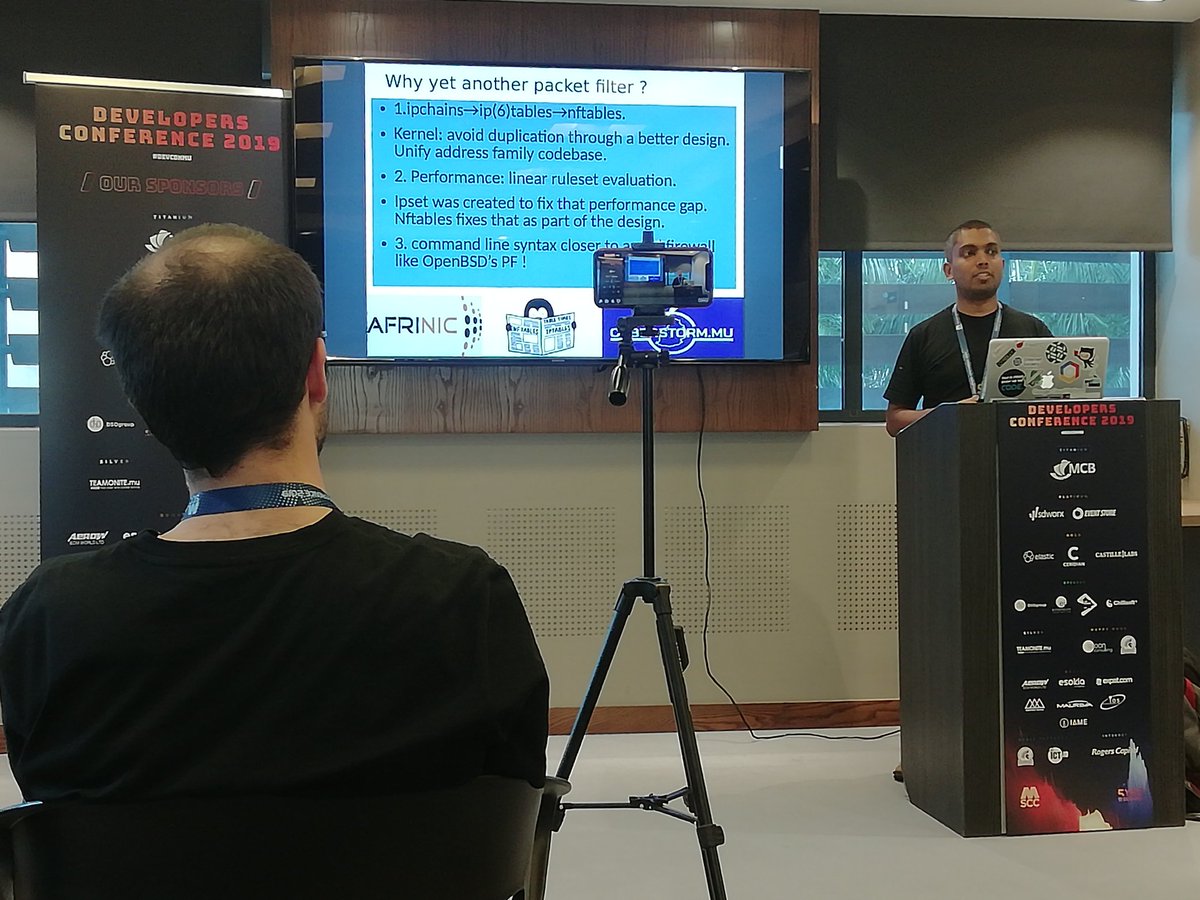 There was another session by Loganaden Velvindron of Afrinic, who spoke on NFtables in RedHat 8. Mukom was also present there in the session. Loganaden explained about NFtables architecture and its advantages. Also explained how to submit patches and dual stack building with NFtables.