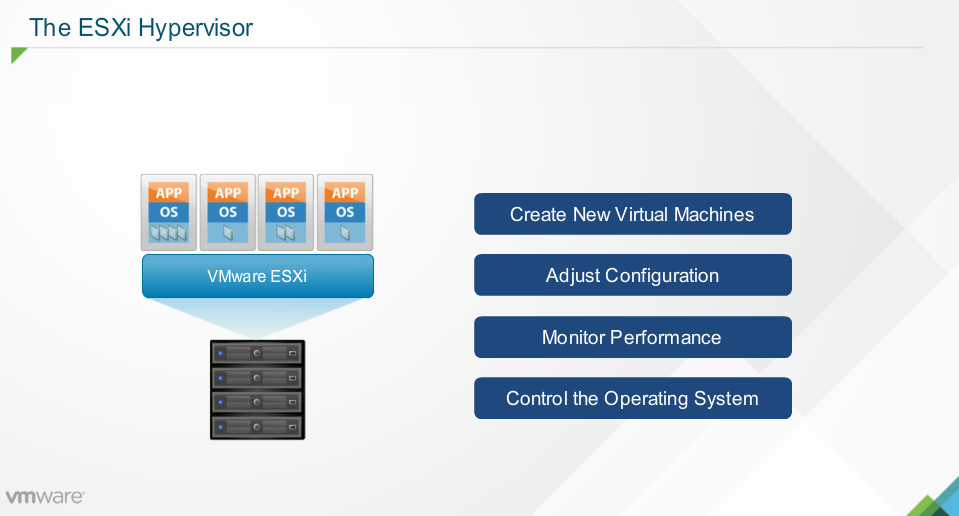 The ESXi hypervisor is a bare metal hypervisor that performs resource management while directly accessing the underlying physical hardware. It improves resource efficiency because of low operating system overhead. ESXi is not dependant on other operating system. ESXi hosts virtual machine provides management functions to help, deploy and control them.