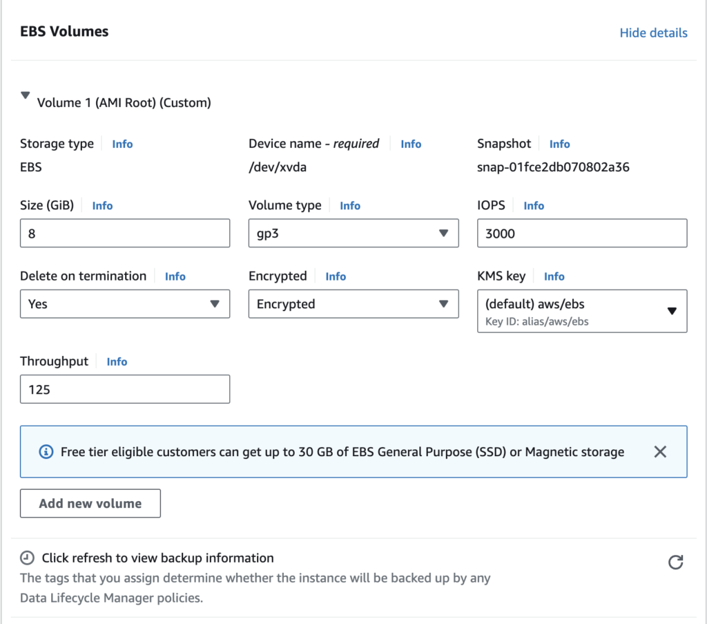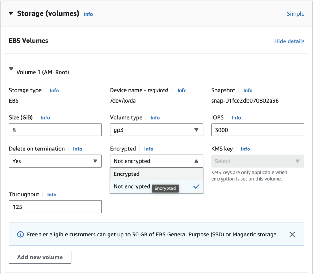 2. Under "Storage" go to advanced, and choose "encrypted" for encryption