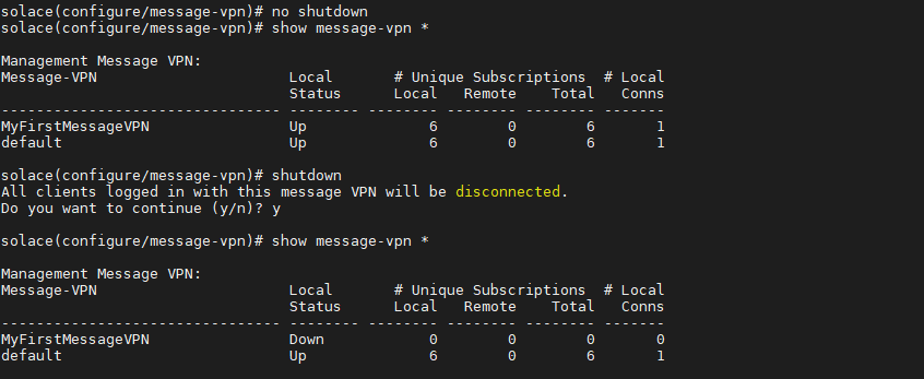 2. Now turn the message-vpn on, simply do the following command. You can also shutdown the VPN and solace will prompt that all client will be disconnected. However, the default VPN remains up all time because when creating the message-vpn it brings you inside it.