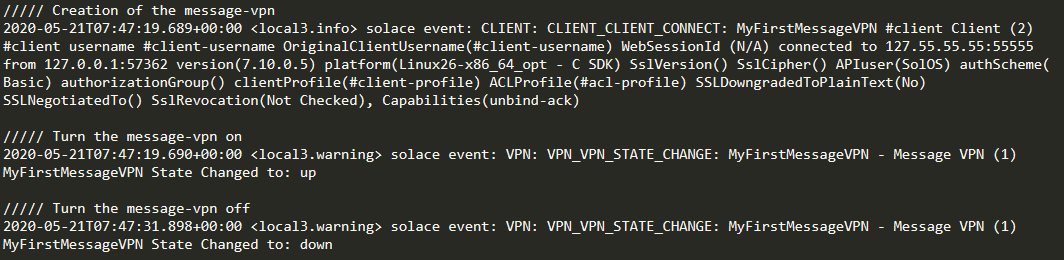 3. Notice that the log speaks everything when I create, turn on, and turn off the message-vpn. Also, the command log locate at