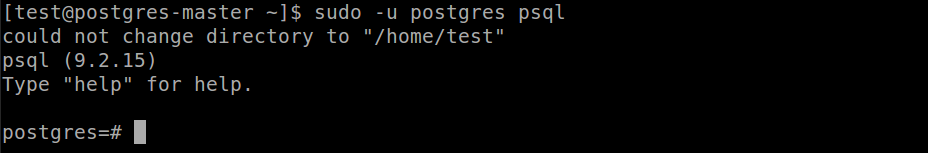 10. Lets create a database with the superuser. You might need to add your user to the group postgres with the command usermod -g test postgres as postgres will need permission to access your home directory to drop the .psql_history file