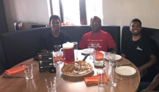 Celebrating with beer and pizza at Flying Dodo Bagatelle