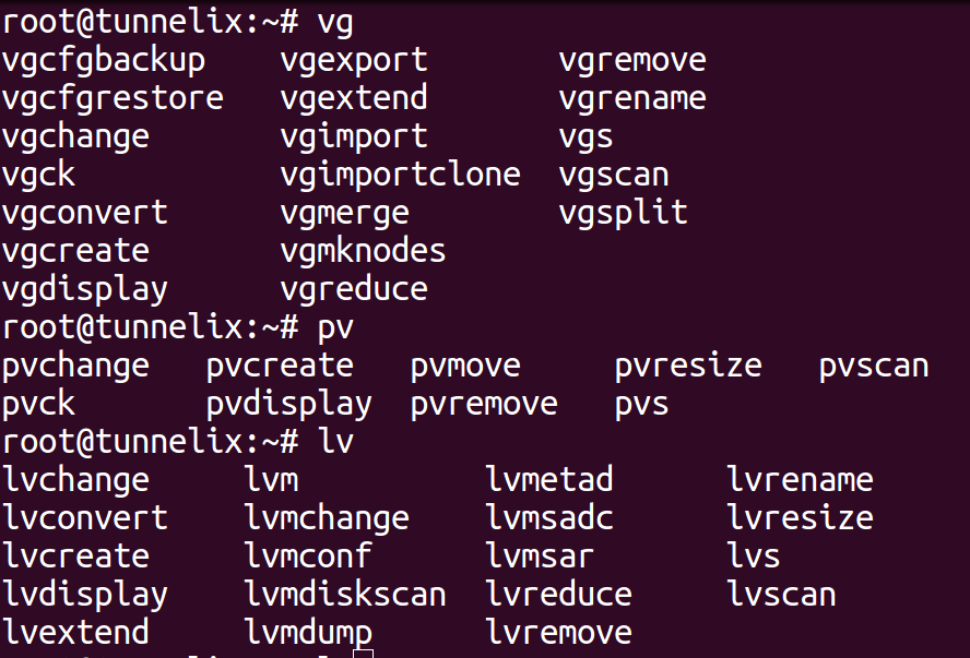 On Linux, if you type vg or lv or pv press tab twice you will have an idea all the commands that exist and possibilities of manipulation. On part2 of this article, I will take an example of the pvmove command and actions that could be done to minimize impact before carrying out a pvmove operation.