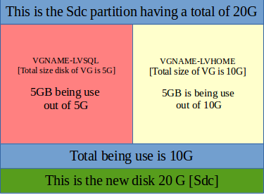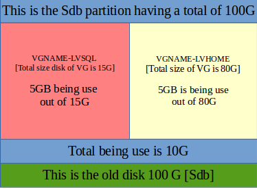 Let us say we have a disk of 100G [lets called it sdb] and we have to replace it with another disk of 20G [sdc]. We assume that there is 10G of data being used out of the 100G hard disk which looks reasonable and possible to be handled by the 20G hard disk that we have planned to shift to. On our Sdb we have 2 LV lets call it lvsql that is being used by MySQL having the database there and lvhome handling the rest of the server applications. See illustration from the diagram on the right. Both LVs are found in the same VG called VGNAME.