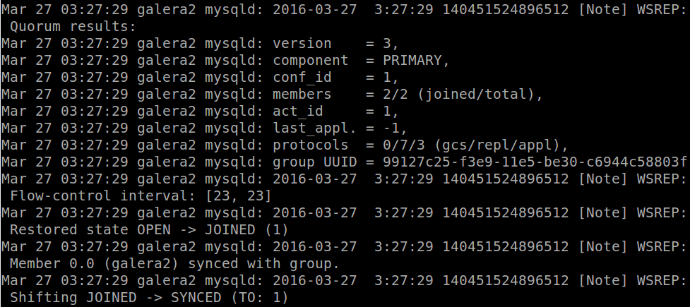 10. Once mysql is started with the command service mysql start, you would noticed that galera2 is now on replicating from cluster1. You should noticed something similar to this on your log.