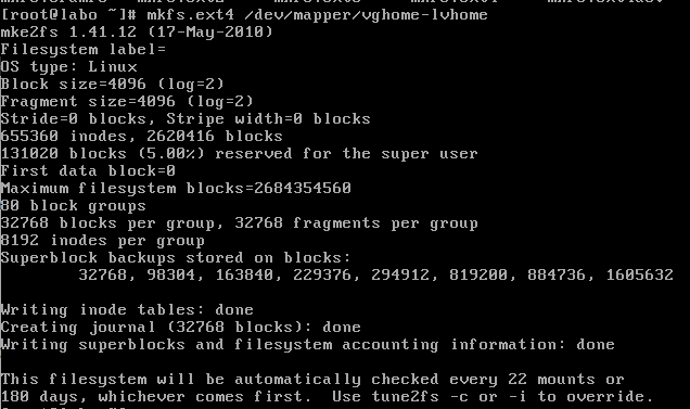 - mkfs.ext4 /dev/mapper/vghome-lvhome