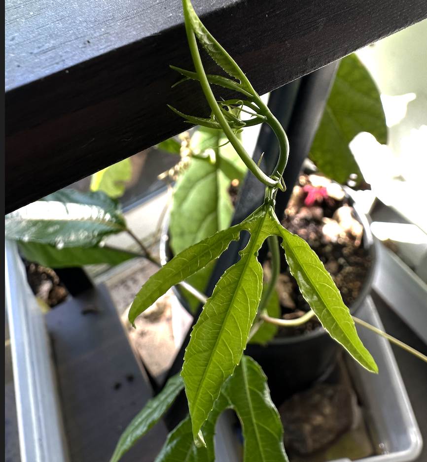 I have another two of these vines. They are tropical fruits. At some point this winter I need to put some support so that they can keep on climbing into it. Next year will re-pot it.