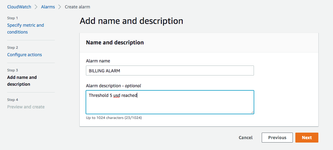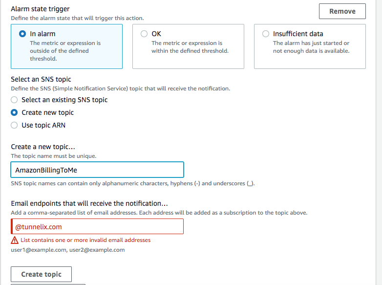 Then, hit next and "Create a Topic" add a message to alert you about billing, enter an email address. Then "create topic"