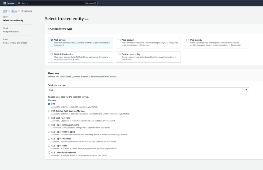 IAM -> Create roles -> AWS Service -> Choose EC2