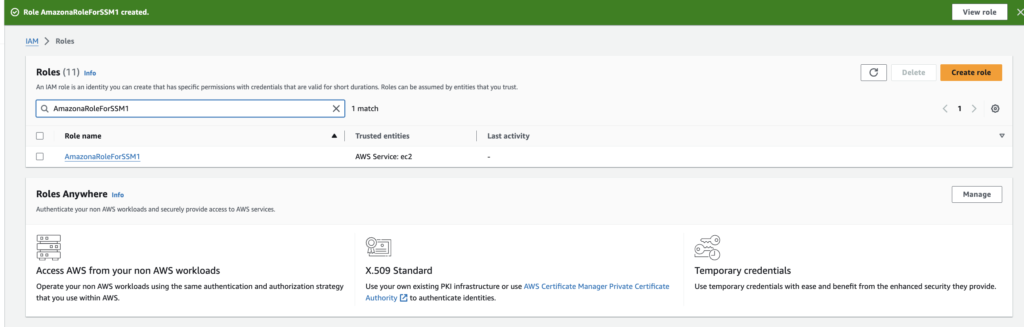 4. Now, need to attach the policies to the role: attached the following Policies (I searched SSM): AmazonSSMManagedInstanceCore. Hit next. Then give the role a name, for example: "AmazonaRoleForSSM1". Create the role