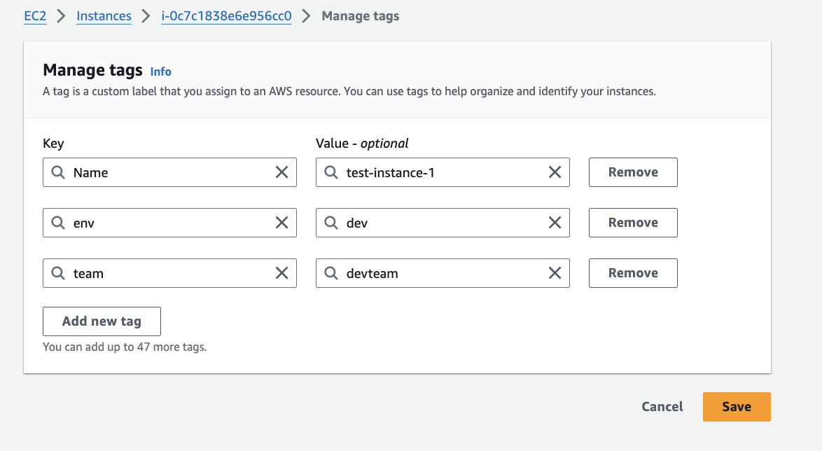 AWS Tags are used to add test key-value pairs to AWS Resources. Apart from identifying AWS Resources, it can also be used for Automation and Cost Allocation. I will now add Tags to those instances associating the Name, Environment, and Team.