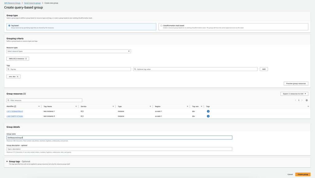 Under Grouping criteria, search for EC2::Instance to narrow the search. The search for the tags "env" with value "dev". Hit the "Add" button. By clicking the "Preview" button, it will search for all EC2 instances with those specific tags. I also named it as "DevResourceGroup1"