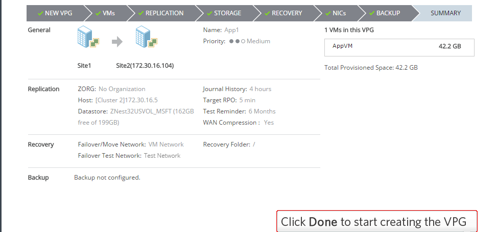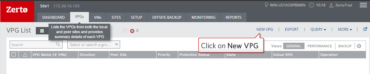 To create a VPG click on the VPG button which will list the VPGs from both the local and peer sites and provides summary details of each VPG. To create a new VPG, you have to click on the "New VPG" button.
