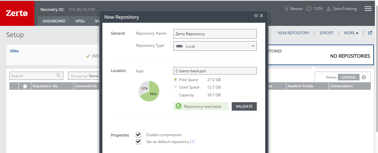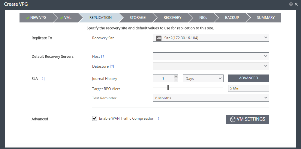 The Replication tab covers details of the recovery/target site as well as the default value to use for the replication. If you have multiple site from the ZVM it can be selected in the Recovery Site option. The journal is a powerful feature. The journal is a dynamic record of every checkpoints in the history according to the values specify here. By default the value is one day and a journal is always on and stored on recovery site. If production is down, failovers are still possible by not writing changes locally first. The WAN traffic compression allows data to be compressed first before data is transmitted to the recovery site.