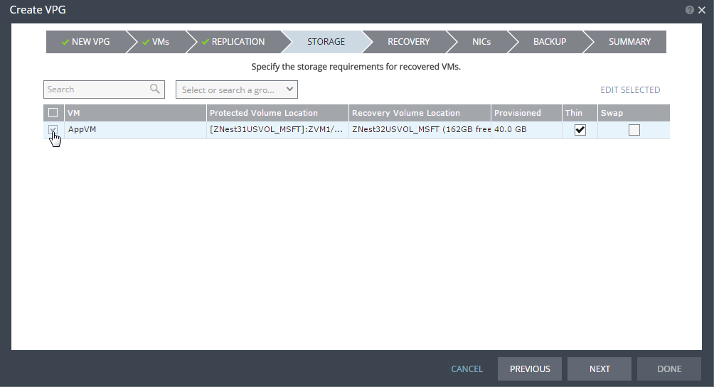 The storage tab list the VM in the protection group and are associated with volumes details. If a VM is on thin provision during creation, ZVR uses that same thin provision or dynamic disk set up here by default. The "Edit Selected" button allows you to change this and to replicate swap disk if needed. Storage can also be moved from one datastore to another.