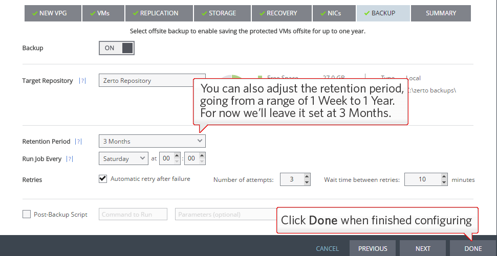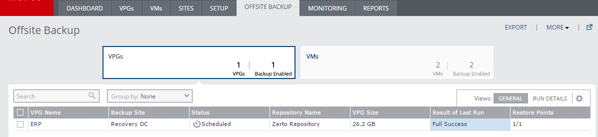 Backup can also be run manually from the offsite backup menu. The offsite menu will appear once you activate it on the VPG backup menu.