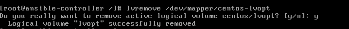5. Now, let's pretend to remove the lvm lvopt. Or say, someone did it by accident because it was unmounted. The command lvremove will be used here to remove the lv. Note: that the lv need to be unmounted.