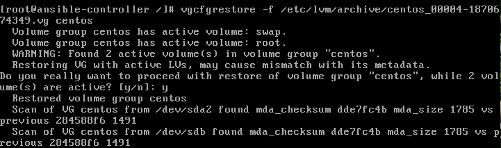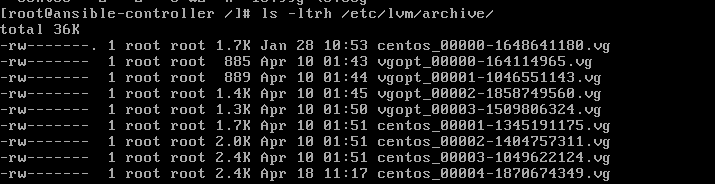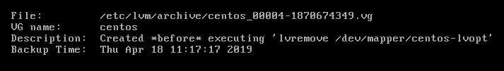 9. So, I want to restore from that last archive. You will need to copy the full patch of the vg file. In my case it is /etc/lvm/archive/centos_00004-1870674349.vg. The goal here is to restore the lv before this specific time, or simply restore back the lv before the command lvremove was fired. Here is the command: