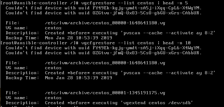 7. But you can still, interpret part of the files. Since we deleted the volume group called "centos", we knew that it is referenced in the file centos_... The question that arises here is which file is relevant for you. Right? So to understand which archive you want to restore, you need to use the command vgcfgrestore --list <name of volume group>. Here is an example: