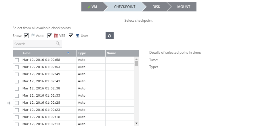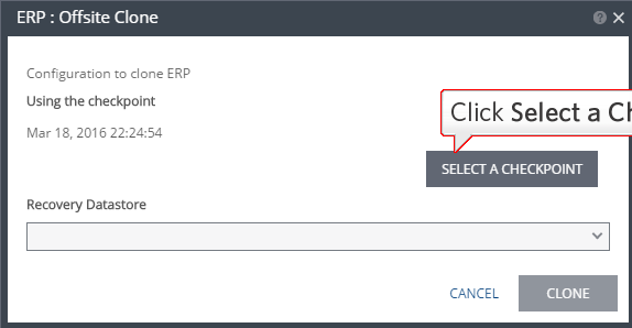 Once on the Offsite Clone tab, click on Select a checkpoint.
