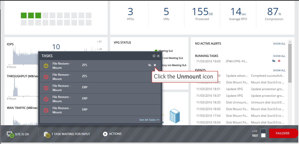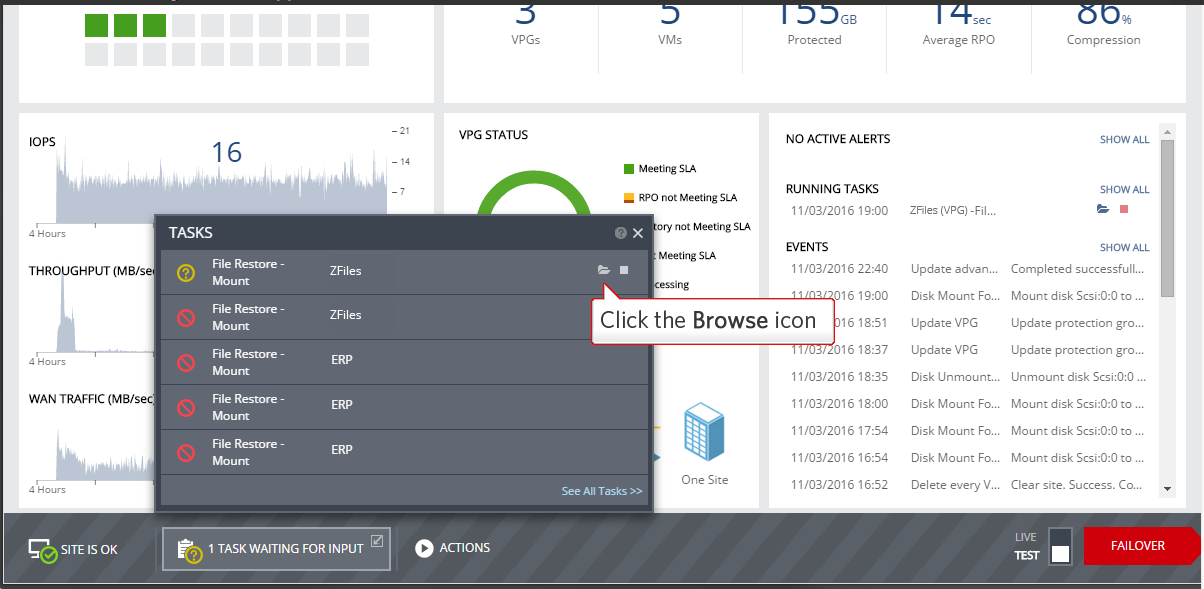 As usual, the running tasks will be shown running on the dashboard. There are few ways to start restoring files and folders from the mounted disk, including from the monitoring tab or the open folder icon on the right under the running tasks.