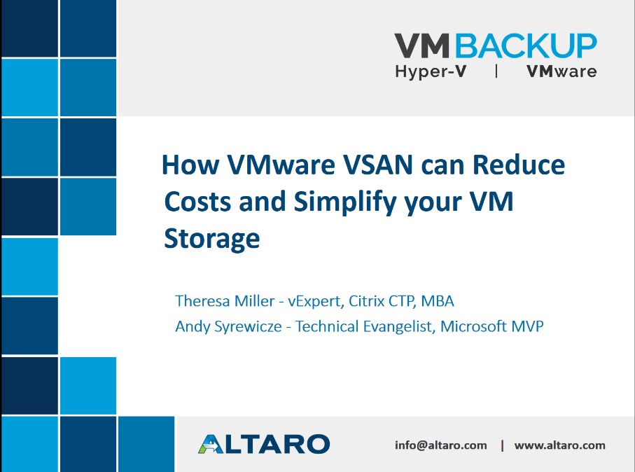 I recently attended another meeting on VMware VSAN by Altaro - How VMware VSAN can reduce cost and simplify your VM storage ? This presentation was carried out by Theresa Miller, vExpert and Andy Syrewicze, Technical Evangelist. A brief explanation of how large group of people use to manage simple solution compared with VMware VSAN technology. Nowadays, there is the creation of single point to manage those virtual machines. This is where hyper-convergence came from as SME's and SMB's are looking for high availability.