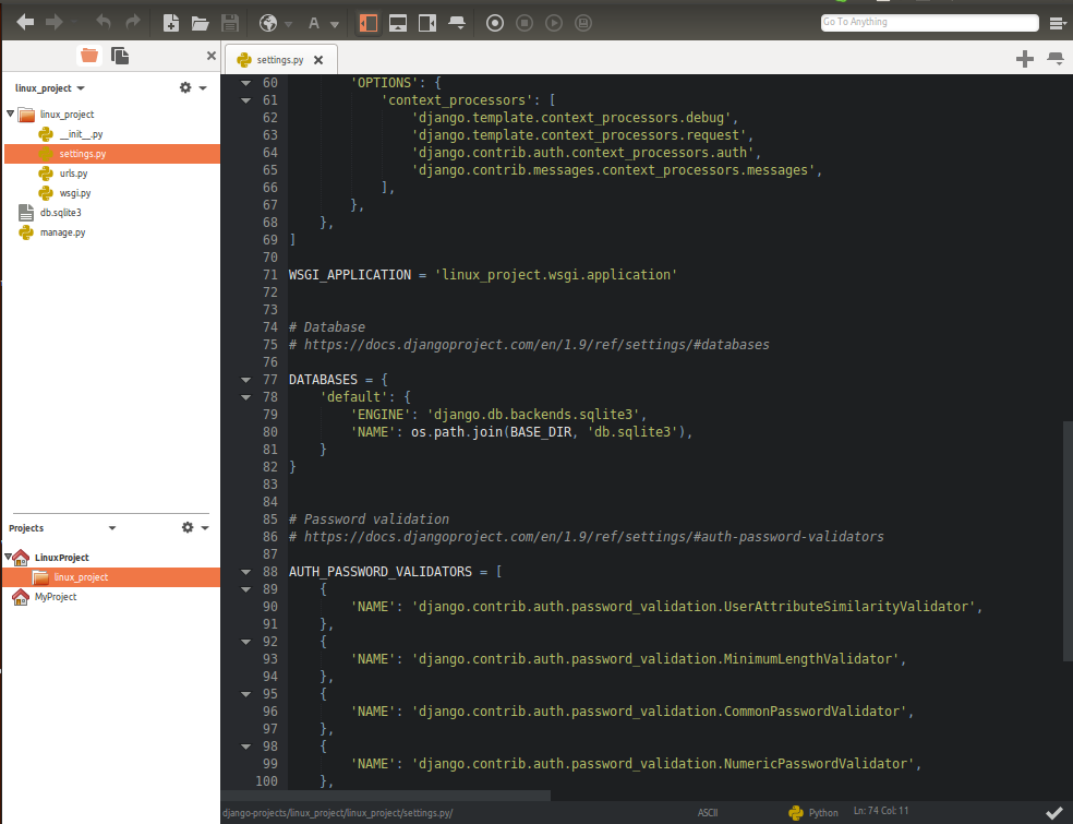 6. Now, open Komodo-edit. Create a new project in the same directory where your project has been created. Save the Django project with Komodo. It should looks something like this: