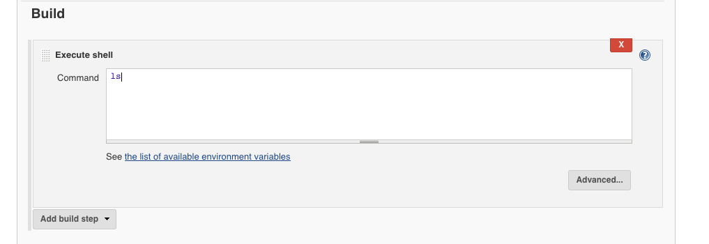 7. Scroll down, go to "Build", and in the "Execute shell command" box you can just put a shell command there.