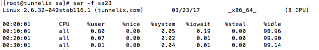 As promised on Twitter days back, I would post some interesting tips and tricks using the SAR (System Activity Report) linux command. The sar command writes to standard output the contents of selected cumulative activity counters in the operating system. The accounting system, based on the values in the count and interval parameters, writes information the specified number of times spaced at the specified intervals in seconds. If the interval parameter is set to zero, the sar command displays the average statistics for the time since the system was started. - die.net