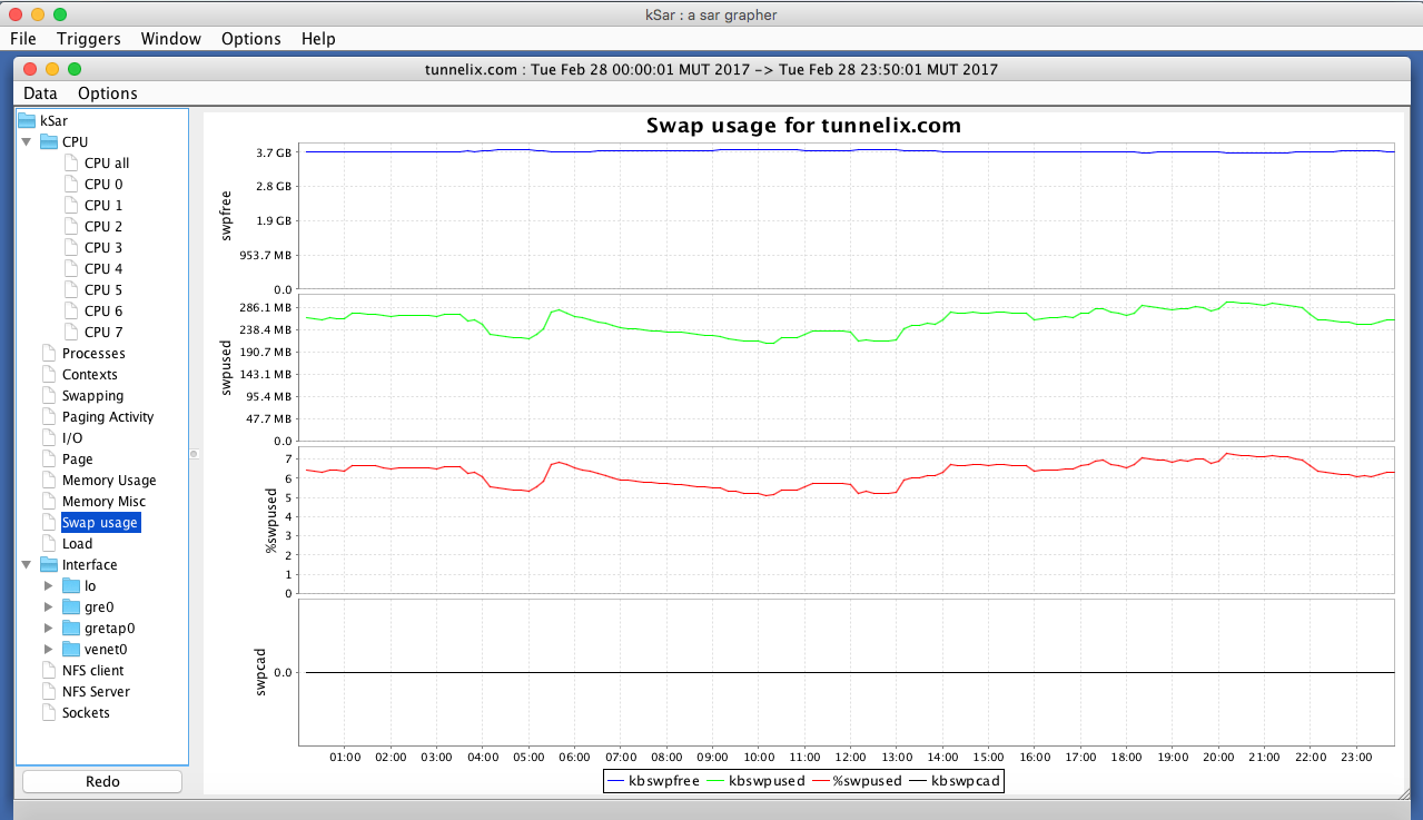 Now, in production environment, you need to to analyze for example at a specific time where memory or CPU was high. This can be done by means of a graph. I use the Ksar program. Ksar is a BSD-Licensed JAVA based application which create graph based on sar logs. You will need to install JAVA Runtime and launch the run.sh script to install the Ksar program. Once downloaded, just click on 'Data' and 'Load from text file'. This is an example of swap usage