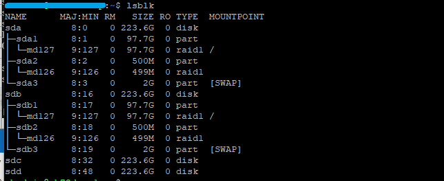 1. This is the output of the lsblk. As you can see sdc and sdd are 223.6G each: