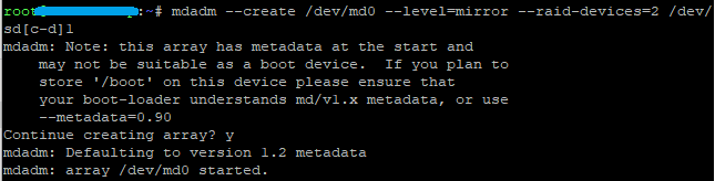 mdadm --create /dev/md0 --level=mirror --raid-devices=2 /dev/sd[c-d]1