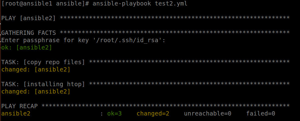So, we can clearly see that the actions will be carried out on the ansible2 server with user root for the task to copy the file epel.repo to the repo of ansible2 following which the installation of htop will be carried out. I have also created a directory in /etc/ansible/files and a file called epel.repo which have the necessary configurations.