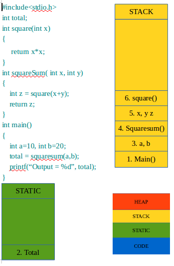 #include<stdio.h> int total; int square(int x) { return x*x; } int SquareSum( int x, int y) { int z = square(x+y); return z; } int main() { int a=10, int b=20; total = SquareSum(a,b); printf(“Output = %d”, total); }