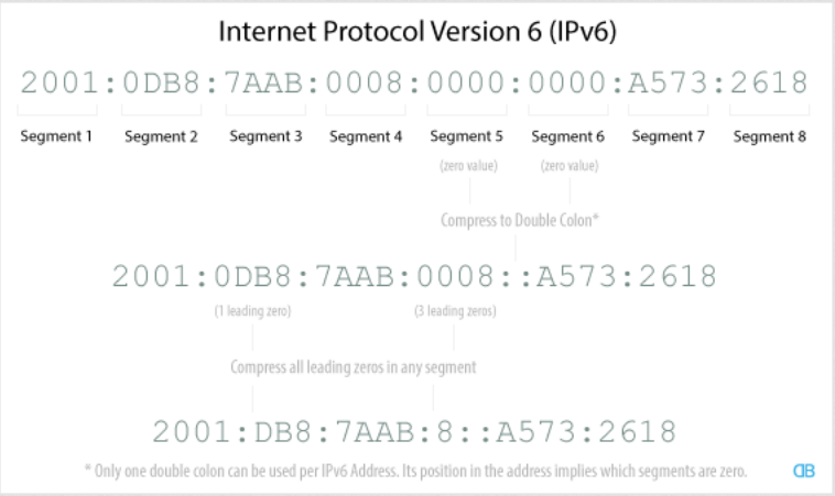 As you can see IPv6 address is composed of 8 segments of 4 hexadecimal strings. A simple math is by multiplying 8x4=32 then 32x4= 128 bits. When representing IPv6 addresses, zeroes are compressed and leading zeroes are further compressed by representing it with ": :" . See picture above.