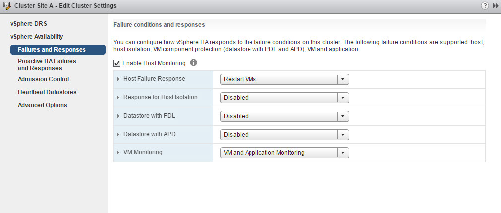 4. Choose 'Failures and Responses' option and click on -> and enable 'VM and Application monitoring'.