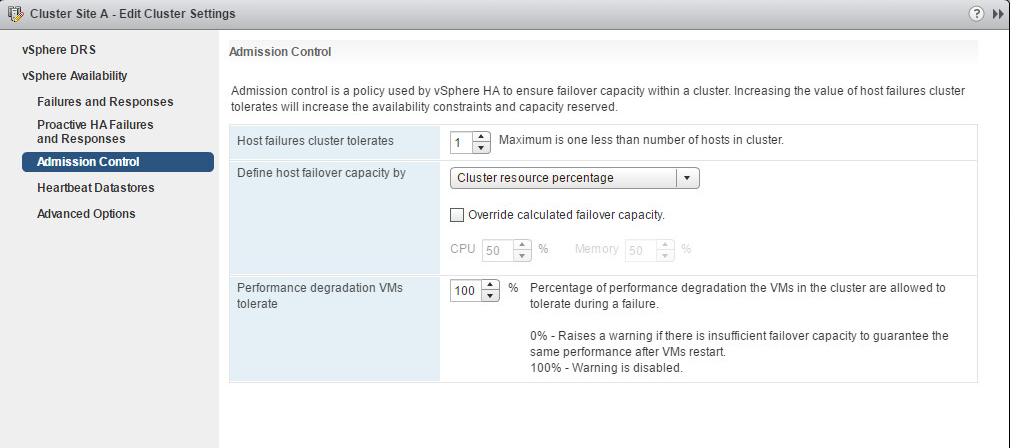 5. On the 'Admission control' -> check the 'Cluster resource percentage' option.