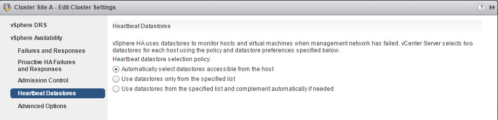 6. Click on 'Heartbeat Datastores' and select 'Automatically select datastores accessible form the host'.